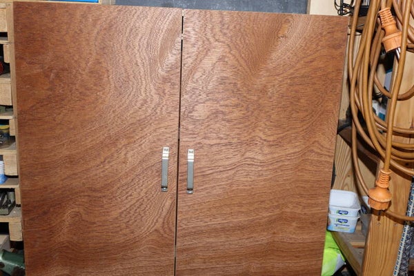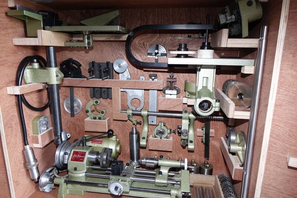 Secuur gemaakte kast van multiplex om alle ooit te koop zijnde accessoires en draaibank in op te bergen.