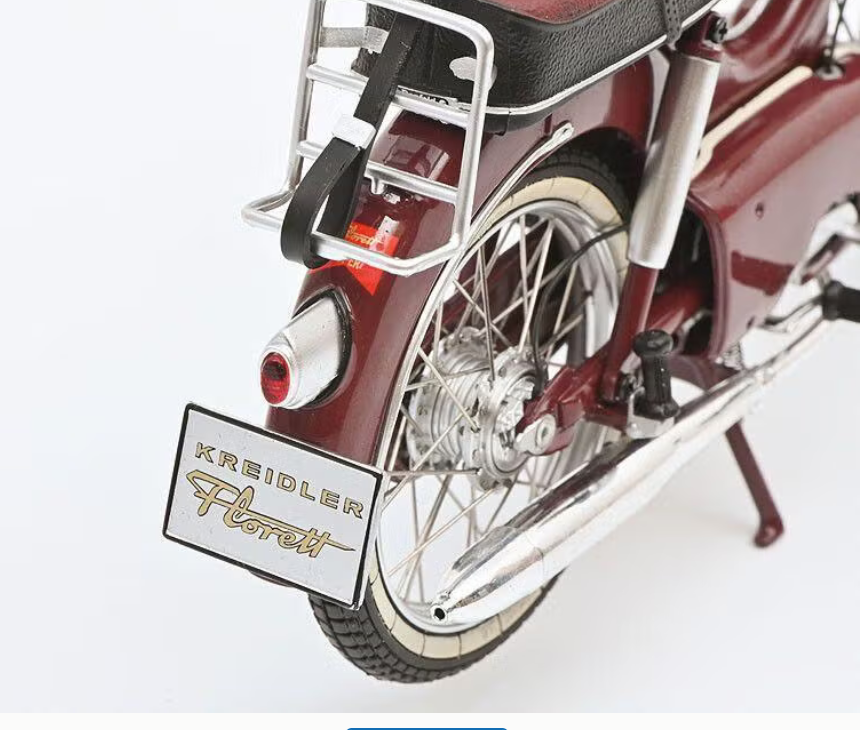 Kreidler Florett Schaal 1:10 donkerrood of brandweerrood of muisgrijs. voor en achter vering opklapbare standaard. Metaal en chroom Lengte ongeveer 18cm Een prachtige eyecatcher. Verbluffend gedetailleerd. Komt in orginele verpakking.